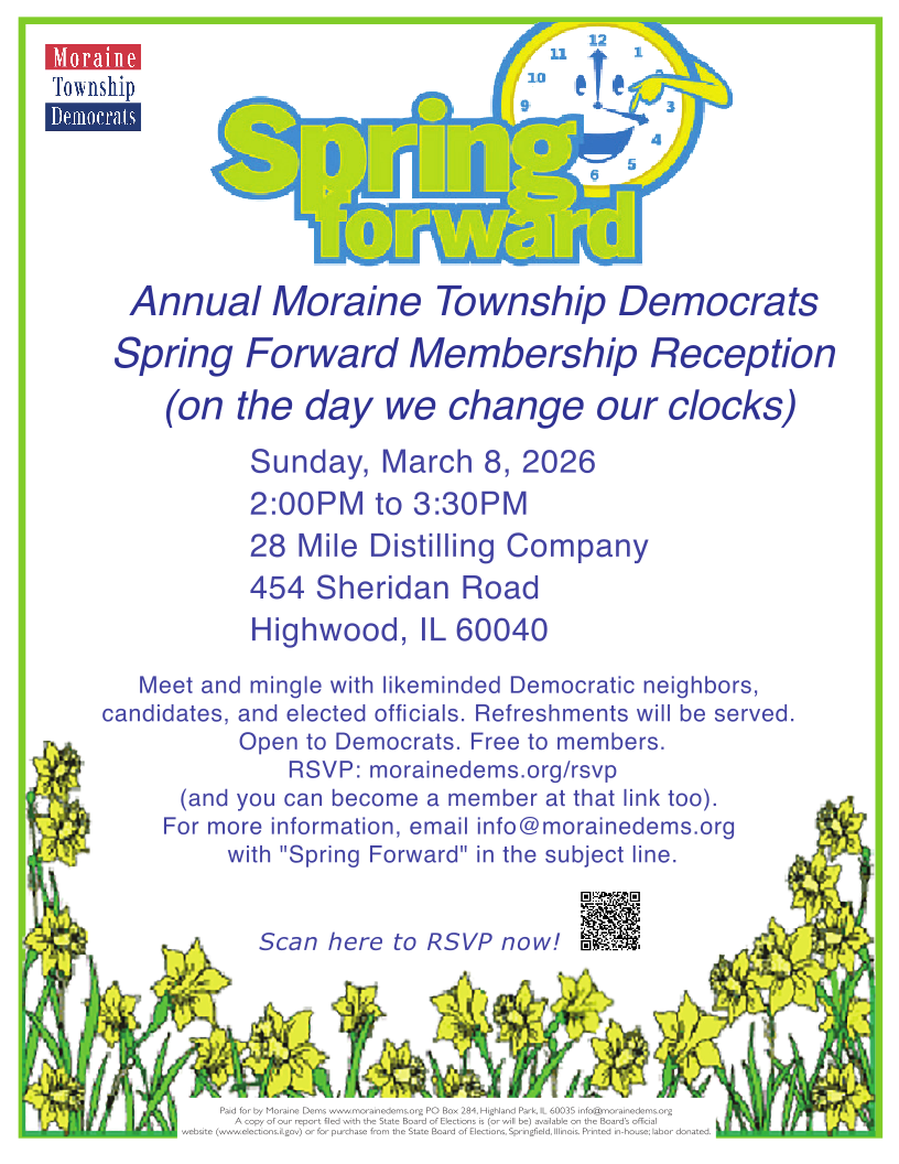 Join us for our Annual Moraine Dems Spring Forward Membership Reception. Sign up here. Details below: