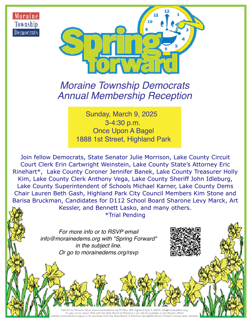 We welcome submisions from other aligned groups along with Democratic candidates and elected officials. If you have an event you'd like us to consider posting, please email us the details at info@morainedems.org or by using the button below.